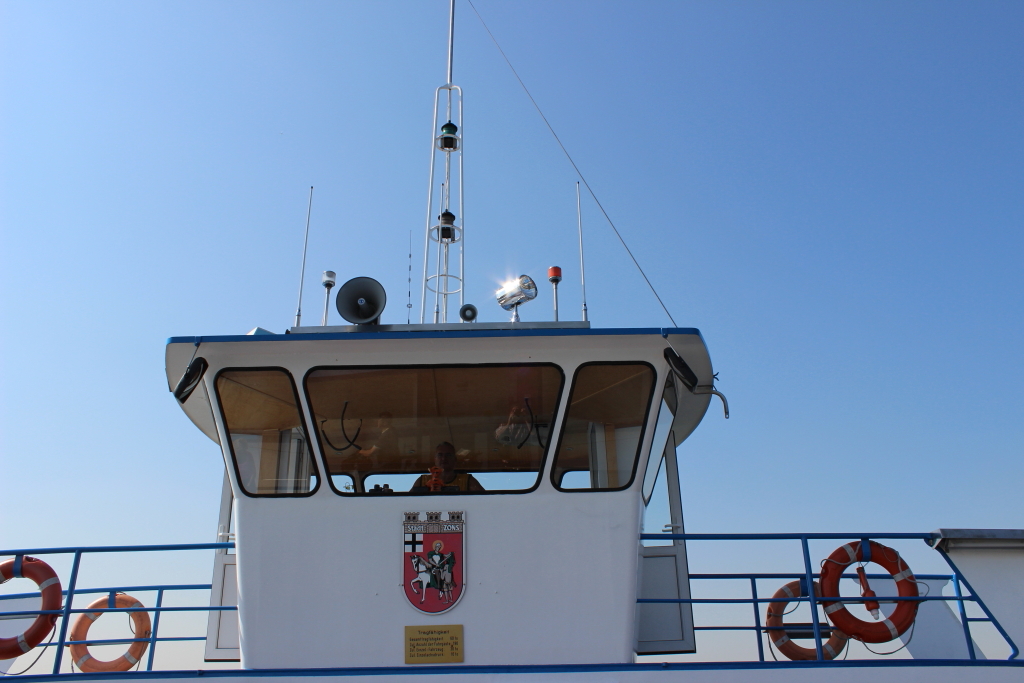 Es war Kaffeezeit und hier schmeckten Kaffee und Kuchen besser als am Vortag! Nach etwas Ruhe setzten wir unsere Fahrt um 14:40 durch die Rheinauen südlich von Urdenbach fort. Dabei passierten wir eine Streuobstwiese, die ans Alte Land erinnerte. Wir wollten nach Zons, das ging aber nur per Rheinfähre.