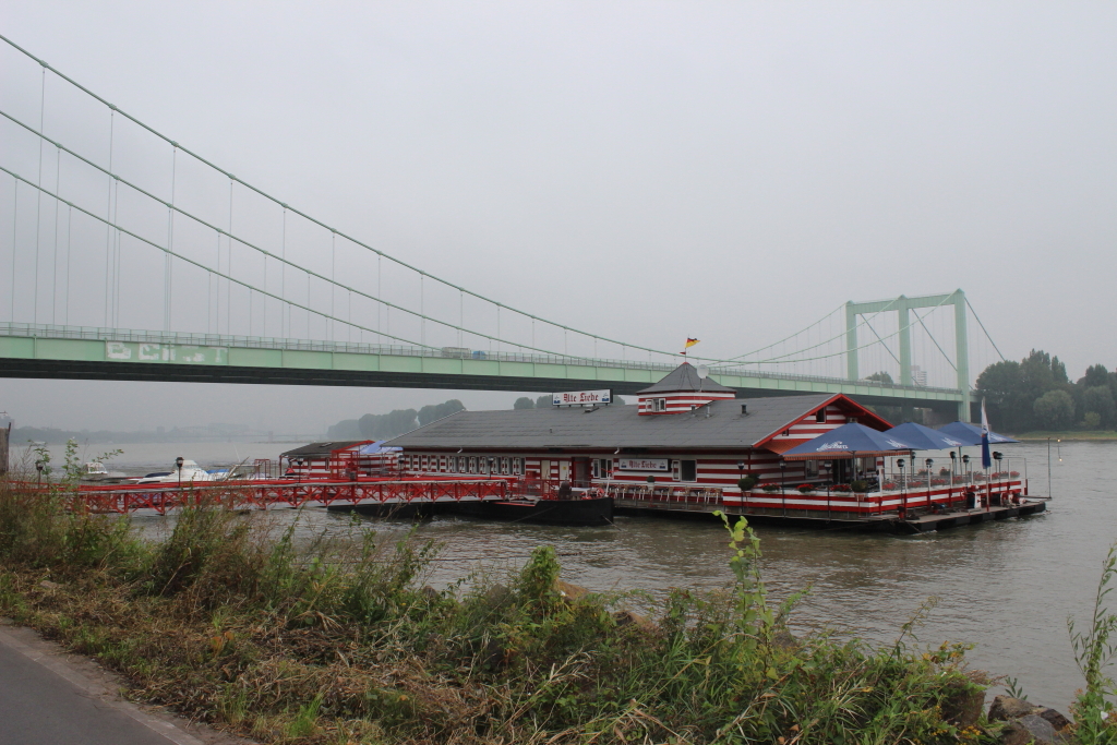 Auf der Westseite des Rheins ging es weiter, oft über die Leinpfade, die wir ja auch von der Ruhr her kennen. Beim riesigen Chemiekomplex Bayer Dormagen mussten wir die B9 benutzen, es war dennoch erträglich. Ab Worringen, südlich des Chemiekomplexes BAYER, konnten wir wieder den Rheindamm mit bester Oberfläche befahren – durch die Rheinauen. An der Fähre Langel – Hitdorf gab es Eis für Werner um 16:25 nach 69 km. Nun waren wir bereits auf Kölner Stadtgebiet, auf der anderen Rheinseite liegt Leverkusen. Um die Fordwerke mussten wir herumfahren, dann ging es weiter am Rheinufer entlang.